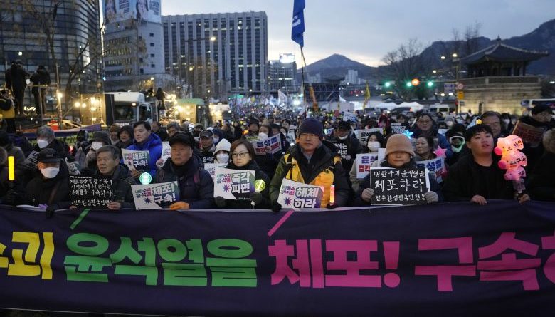 Cientos de surcoreanos abrigados para enfrentar la nieve y las temperaturas bajo cero protestaron durante la noche hasta la madrugada del domingo cerca de la residencia del presidente Yoon Suk Yeol, quien fue apartado del cargo, pidiendo su destitución y arresto, mientras las autoridades se preparaban para renovar sus esfuerzos para detenerlo por su breve decreto de ley marcial.